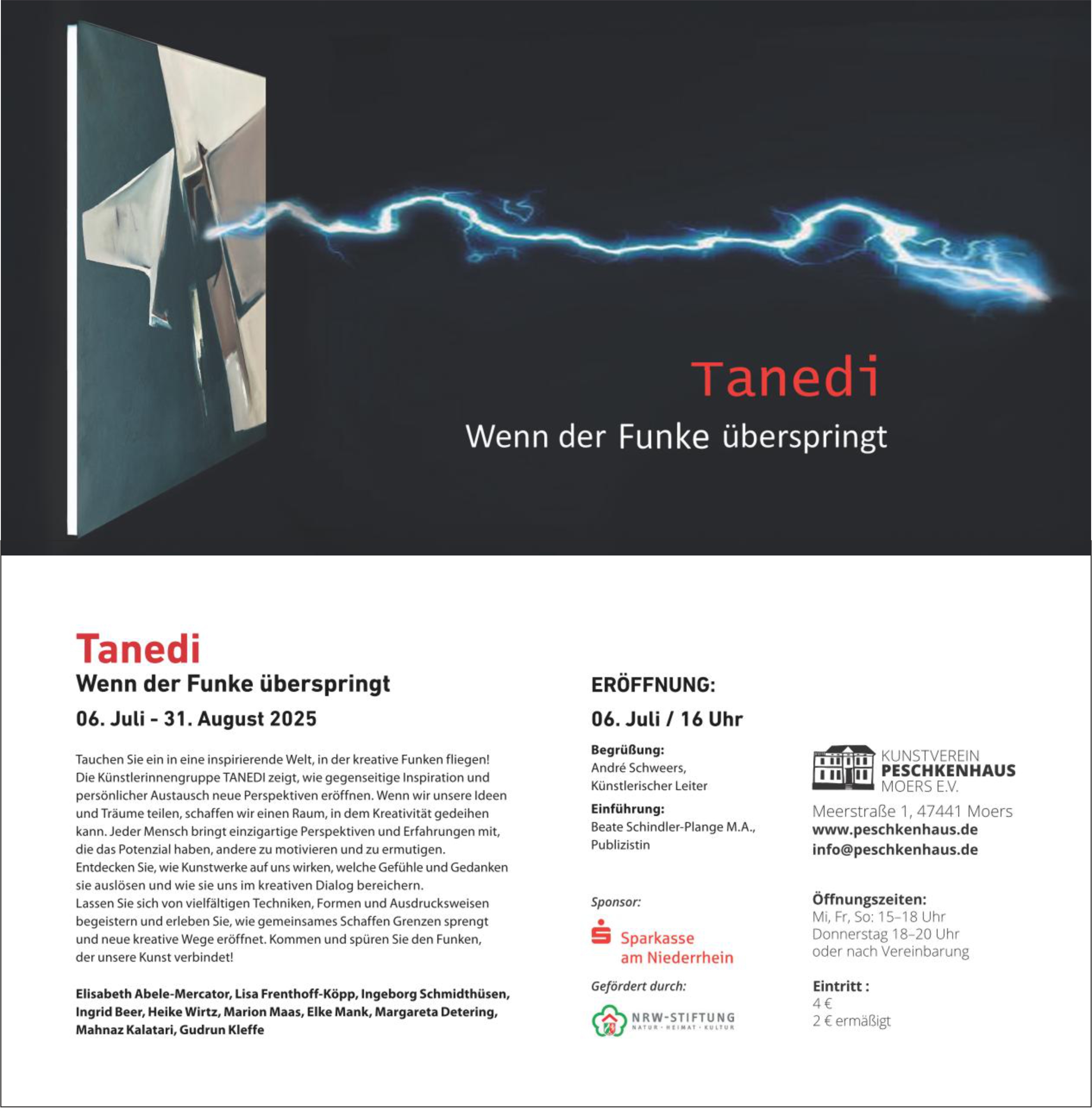 2025 | Peschkenhaus, Meerstr. 1, 47441 Moers Mittwoch, Freitag, Sonntag von 15:00 bis 18:00 Uhr Donnerstag von 18:00 bis 20:00 Uhr Vernissage: 06. Juli 2025 um 16:00 Uhr | ||||