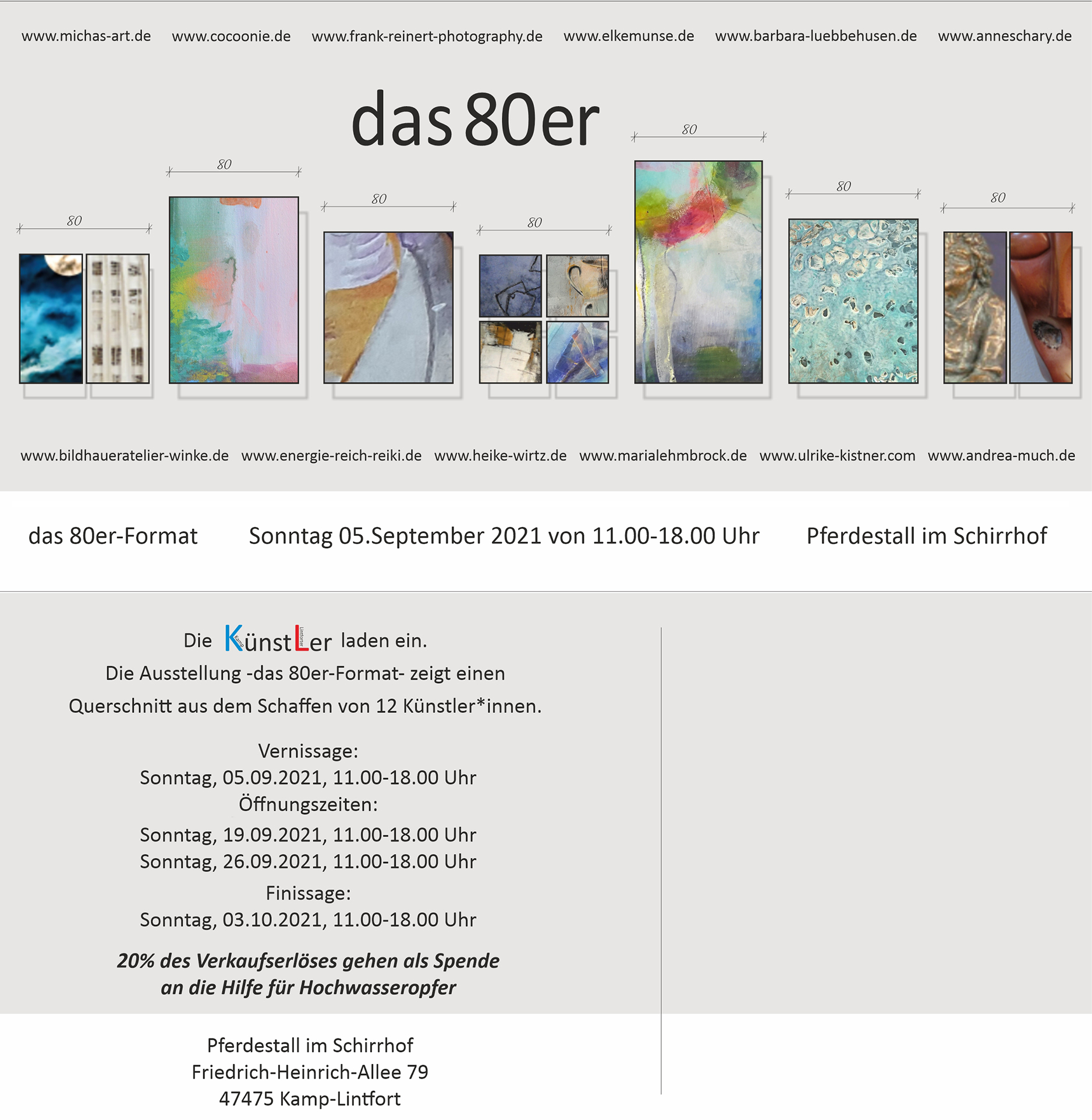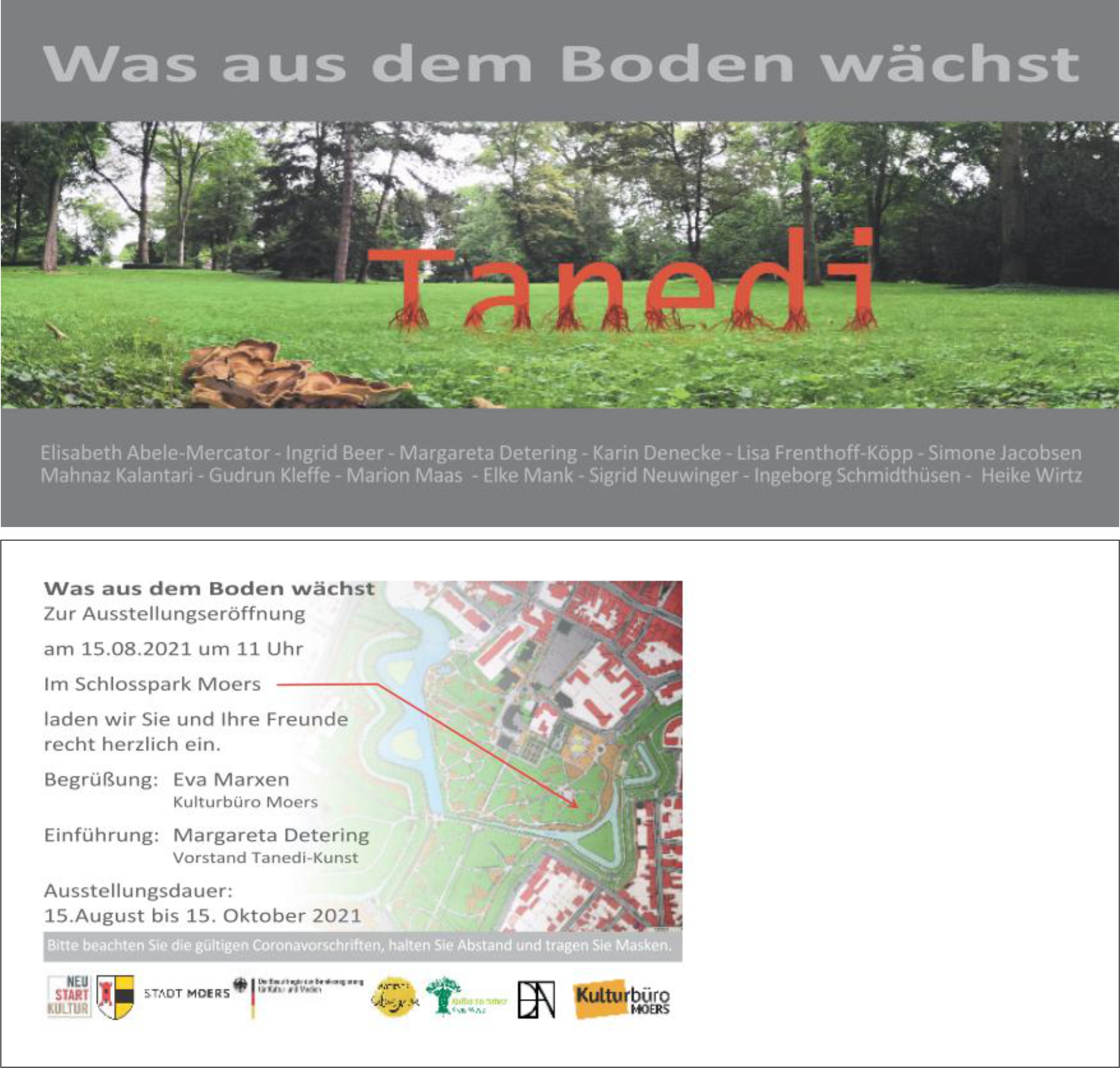 2021 | Advent im Atelier, Wilhelmstr. 45a, 47475 Kamp-Lintfort KunstTage Rhein-Erft, Abtei Brauweiler, Pulheim (GA) Was aus dem Boden wächst, Im Schlosspark, Moers (GA) Offene Ateliers, Kamp-Lintfort, 10./11.07.2021 von 12:00 bis 18:00 Uhr | ||||