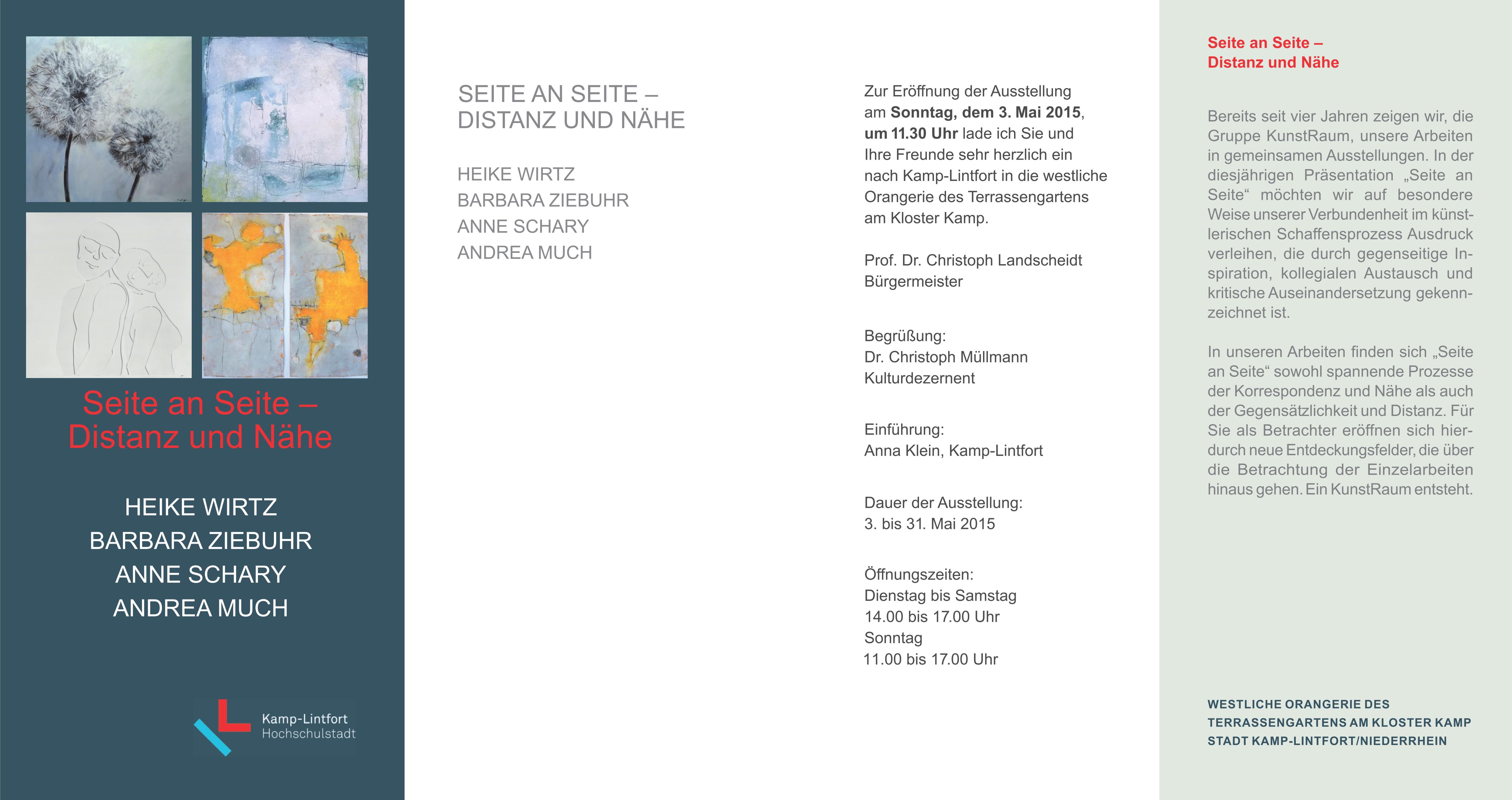 2015 | en-passent - im vorbeigehen, Kunst Kabinett, Duisburg (EA) Cubus Kunsthalle, Duisburg (GA) KunstRaum, Altes Pfarrhaus, Kamp-Lintfort (GA) Kunstmesse Rees, Rees (GA) Seite an Seite - Distanz und Nähe, Orangerie im Terassengarten, Kamp-Lintfort (GA) | ||||