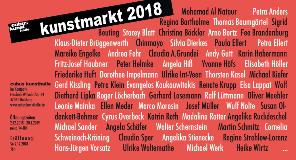 2018 | Auf meinem Weg, Friederike-Fliedner-Haus, Kamp-Lintfort (EA) KunstTage Rhein-Erft, Abtei Brauweiler, Pulheim (GA) KunstRaum, Altes Pfarrhaus, Kamp-Lintfort (GA) Cubus Kunsthalle, Duisburg (GA) | ||||